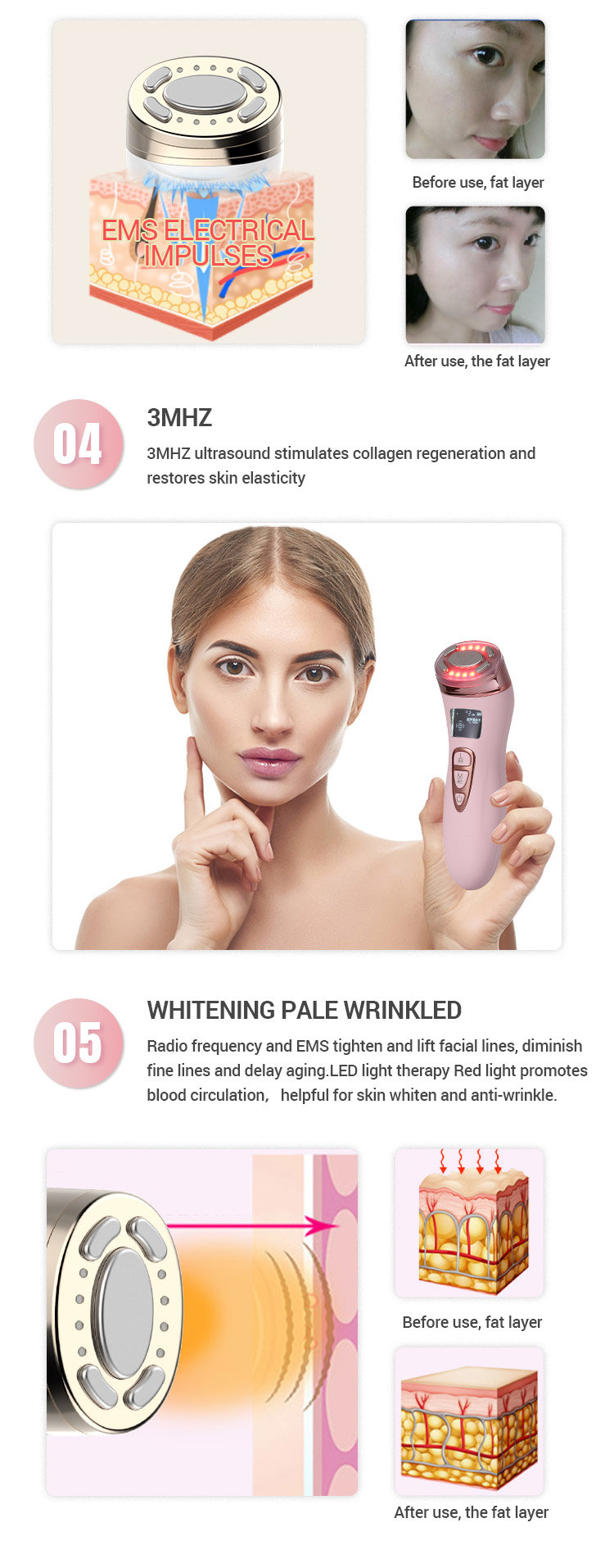 Połączono technologię ultrasondów, RF, EMS, wibracji, ciepła i terapii fontonów światłem czerwonym LED, aby zaspokoić różne potrzeby klienta w zakresie pielęgnacji skóry.