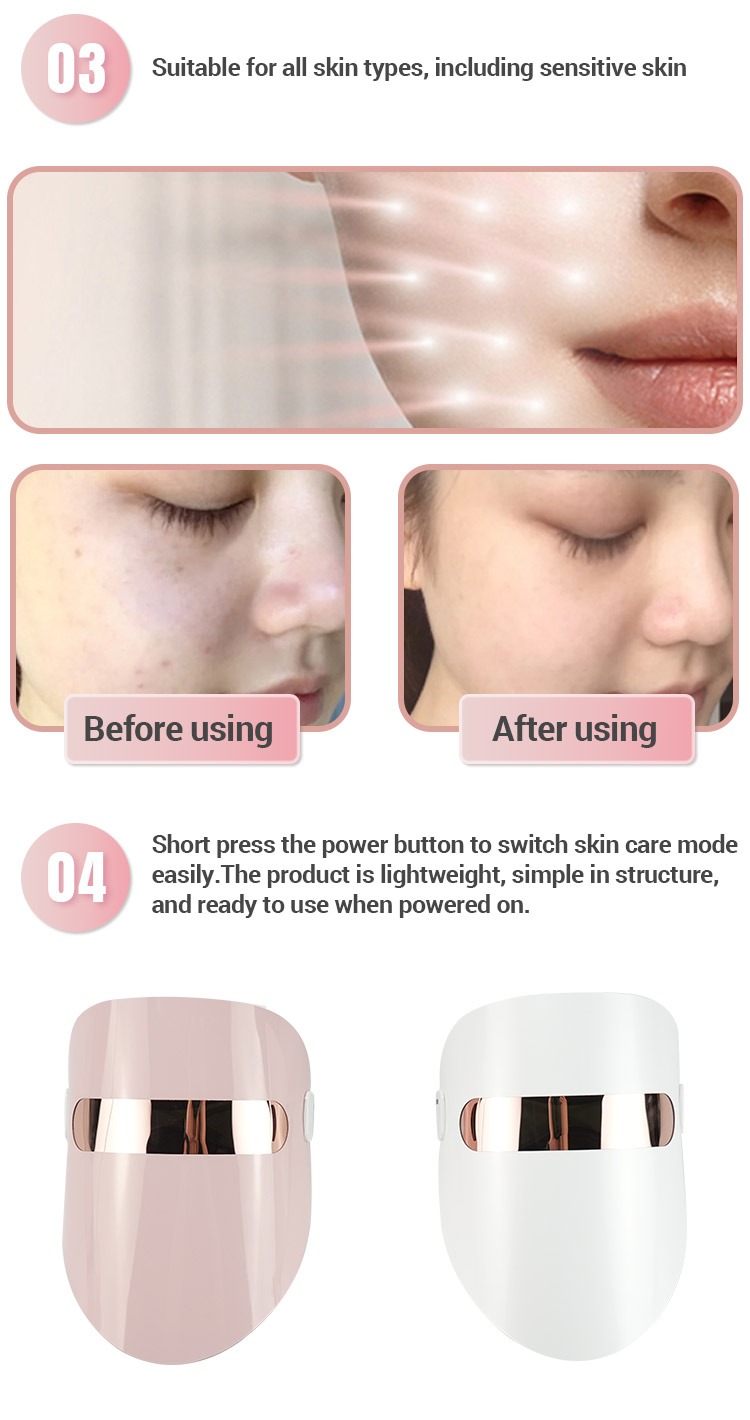 Połączenie czerwonego/żółtego/pomarańczowego światła odmłodzi i rozjaśni skórę, odtworzy idealną skórę bogatą w kolagen.